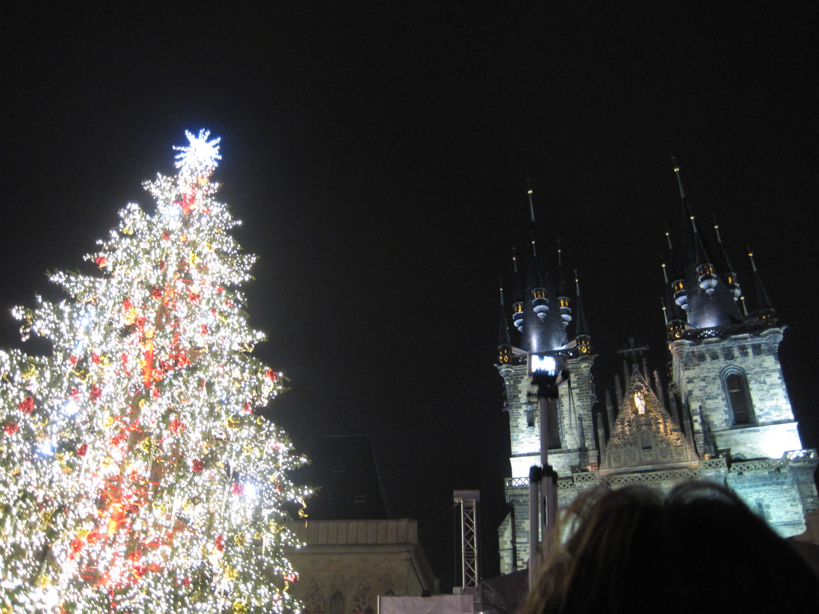 Tonight was the official start of the holiday season in Prague. The Christmas markets opened today in Old Town where they sell tons of souvenir type things, sausages, grog (spiced wine), ornaments, crepes...and so on. It was so beautiful seeing everything lit up but it was VERY crowded for the lighting of the 40 foot Christmas tree in the Old Town square in front of the Tyn Church. A childrens choir sang before the lighting and it got everyone in the Christmas mood and spirit. The tree was lit at 6pm and you can watch the video of it below. There were hundreds of people around it was a crazy scene trying to get out of the square. Lots of pushing and shoving but so worth it to see the lighting! Angela and I immediately played Christmas music when we got back to the room!! One month and I'll be home to enjoy the season in RI but I am so excited to see the season here in Prague!